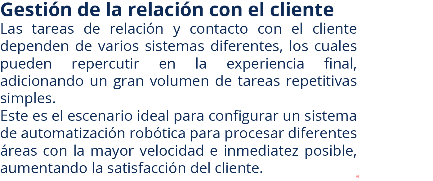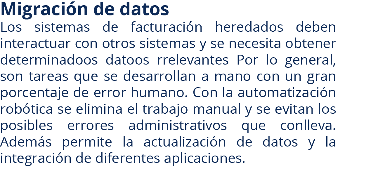Imagine tener a su disposición empleados que trabajan 24 horas al día, todos los días del año, sin enfermarse, sin cometer errores, y a gran velocidad. Esto precisamente es lo que la Automatización Robótica de Procesos hace: creamos robots de software que realizan a la perfección tareas repetitivas (simples o complejas) que consumen mucho tiempo valioso de sus empleados.